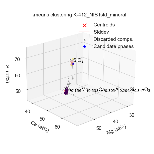 n-points: Number of points in the cluster.El_at%: Atomic fractions of cluster centroid (i.e, average composition of the compositions in the cluster).El_std_at%: Standard deviation of atomic fractions of the cluster compositions.El_w%: Mass fraction of cluster centroid.El_std_w%: Standard deviation of mass fractions.RMS_dist_at%: Root-mean-square distance of points from centroid in atomic fraction space.RMS_dist_w%: Root-mean-square distance in mass fraction space.wcss: Within-cluster sum of squares (in the feature space used).cnd: Identified candidate composition with raw confidence scoreCS_rawand overall confidence scoreCS_cnd(taking into account neighboring candidate phase compositions, which decrease the confidence).mix: Pair of compositions potentially intermixed, with:CS_mix: Confidence score of mixture.Mol_Ratio: Molar ratio (X1 / X2).X1_mean: Mean molar fraction of the first phase.X1_stdev: Standard deviation of the first phase molar fraction.